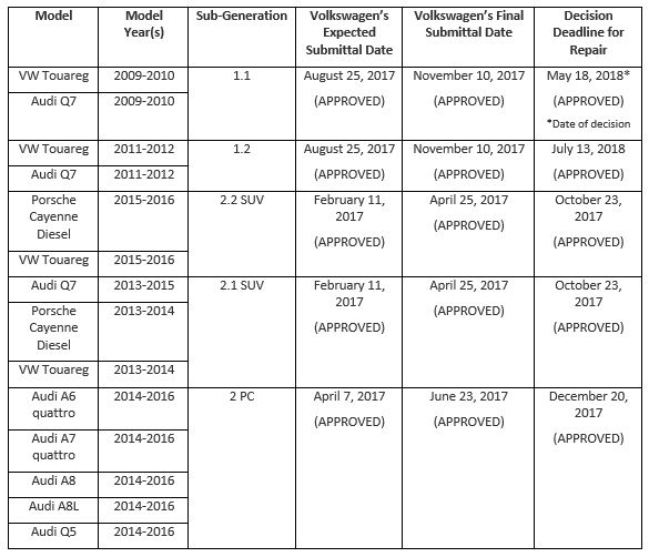 On October 20, 2017, the EPA and CARB approved Emissions Compliant Repairs for the “Sub-Generation 2.1 and 2.2 SUV” vehicles shown in the below chart and, on December 18, 2017, the EPA and CARB approved Emissions Compliant Repairs for the Generation 2 passenger vehicles shown in the below chart. On May 18, 2018, the EPA and CARB approved an Approved Emissions Modification for Generation 1.1 vehicles. On July 13, 2018, the EPA and CARB approved an Approved Emissions Modification for Generation 1.2 vehicles. Volkswagen is permitted to proceed with offering repairs for those vehicles. Class Members will be able to obtain the repair at an authorized Volkswagen, Audi, or Porsche dealer, plus receive an associated Repair Payment.